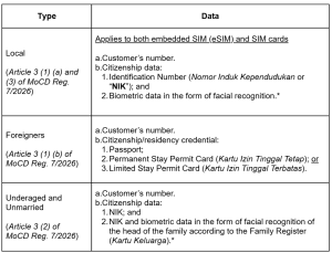In light of the above, we outline below, the key provisions introduced and emphasized under MoCD Reg. 7/2026 for consideration by relevant parties and stakeholders in relation to the implementation and operation of telecommunications services through cellular mobile network systems, particularly Subscriber Identity Modules (“SIM”), in Indonesia.